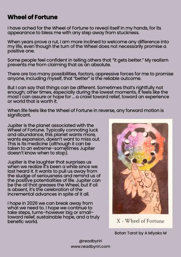 Spokes turning; we are riding the wheel. 2026: we are deep into you and your chaos. Our collective tarot card of the year is the Wheel of Fortune and we asked the Little Red Tarot community what the card of the year means to you. Here's what you said.